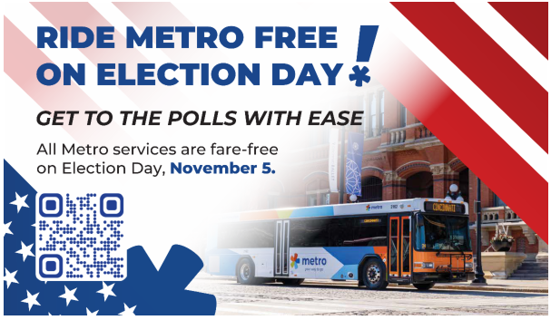 In an effort to ensure accessibility for Hamilton County voters to polling locations, Metro is pleased to announce that all fixed-route, Access paratransit, and MetroNow! on-demand trips will be fare-free on November 5, 2024, for the upcoming election.